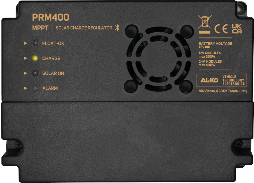 Con il modello PRM400, la gamma di regolatori solari con tecnologia MPPT (Maximum Power Point Tracker) di AL-KO Vehicle Technology Electronics arriva a gestire fino a 400 watt totali di potenza. Questo prodotto è in grado di caricare batterie al litio e al piombo (ad acido libero, gel o AGM) a 12 volt in modo automatico, controllando e limitando l’energia fornita dai moduli fotovoltaici collegati. La tecnologia MPPT gli consente di sfruttare in ogni situazione la massima potenza erogabile dal modulo fotovoltaico e massimizzare l’efficienza di carica (oltre il 20% in più rispetto alla tecnologia PWM). Oltre che sull’app, le informazioni sullo stato di funzionamento possono essere visualizzate su un pannello opzionale. Anche questo dispositivo integra la connettività CL-BUS.
