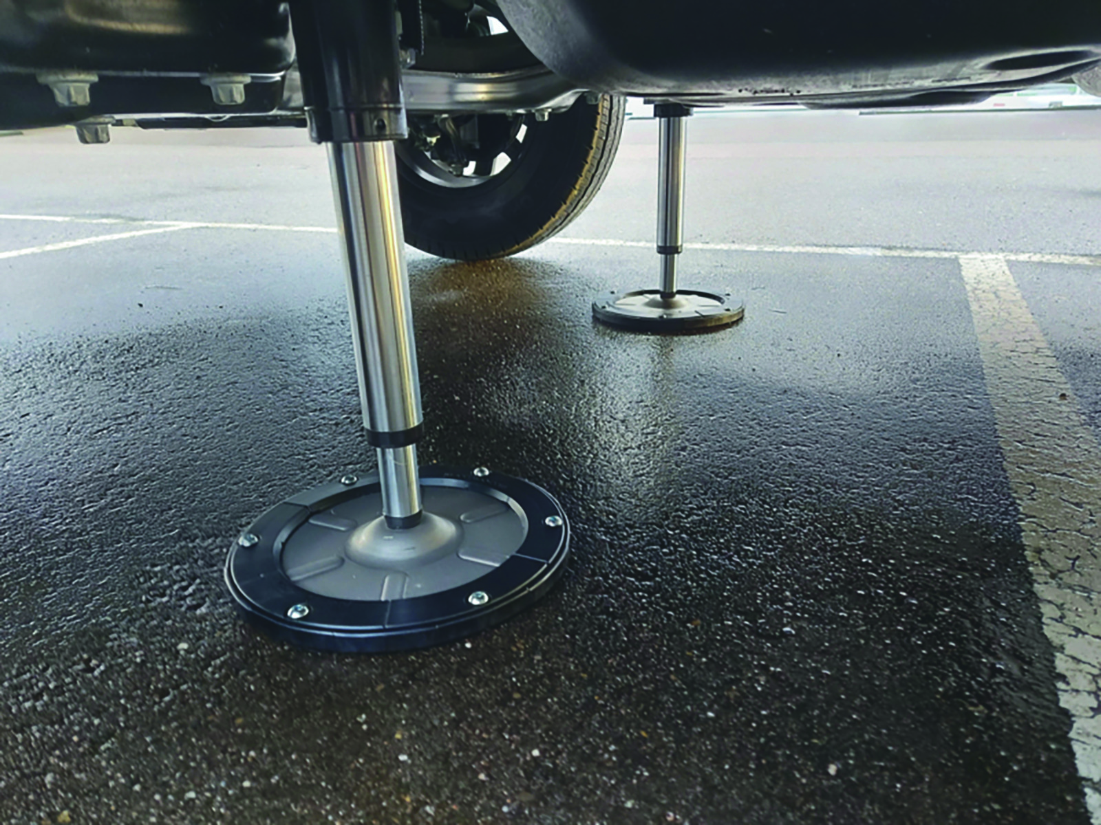 Bestehend aus UV-beständigem Glasfaser-Kunststoff vergrößern die Footplate Cover den Durchmesser der Stützenteller des hydraulischen Stützensystems um rund vier Zentimeter. Was nach wenig klingt, hat eine große Wirkung. Denn durch die Oberflächenvergrößerung von rund 40 Prozent sorgen die Abdeckungen für deutlich mehr Stabilität.