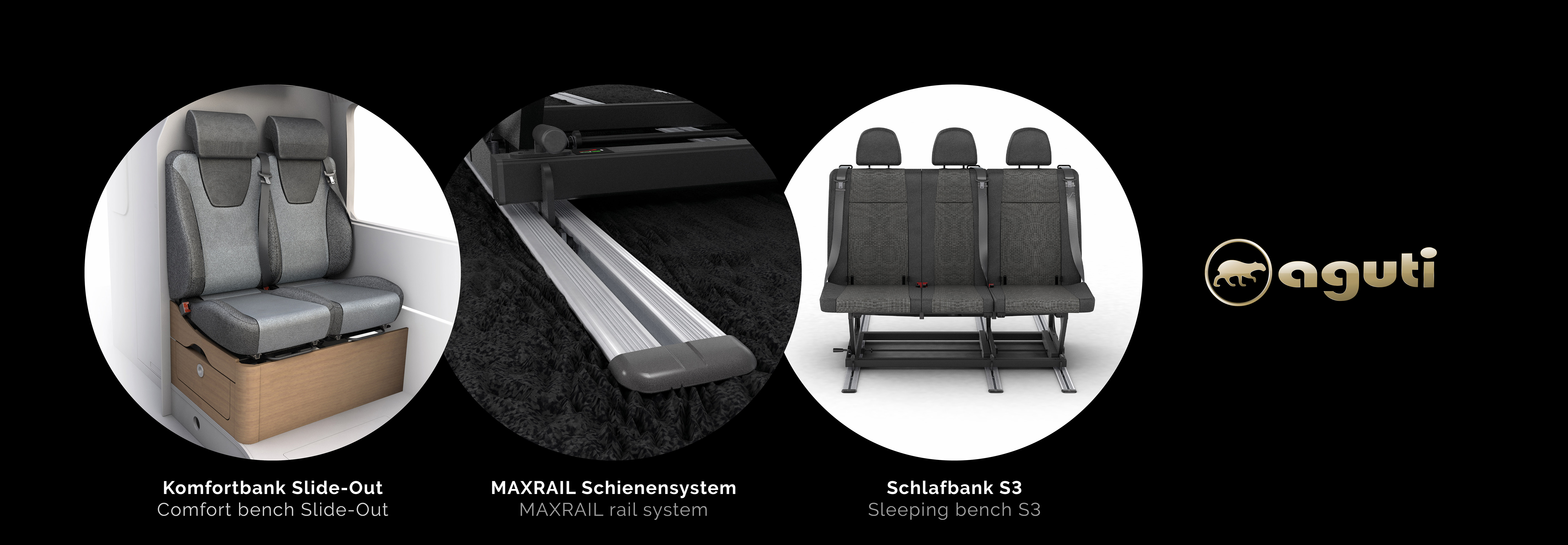Aguti is bringing three new products to the Caravan Salon. The comfortable S3 sleeping bench offers space for three passengers and easily folds into a bed. The new MAXRAIL rail system is a safe and flexible mounting system for camper vans. Enhanced long-distance comfort is provided by the Slide-Out bench with transversely adjustable aisle seat. A meeting booth at the stand is also equipped with seats from Aguti.