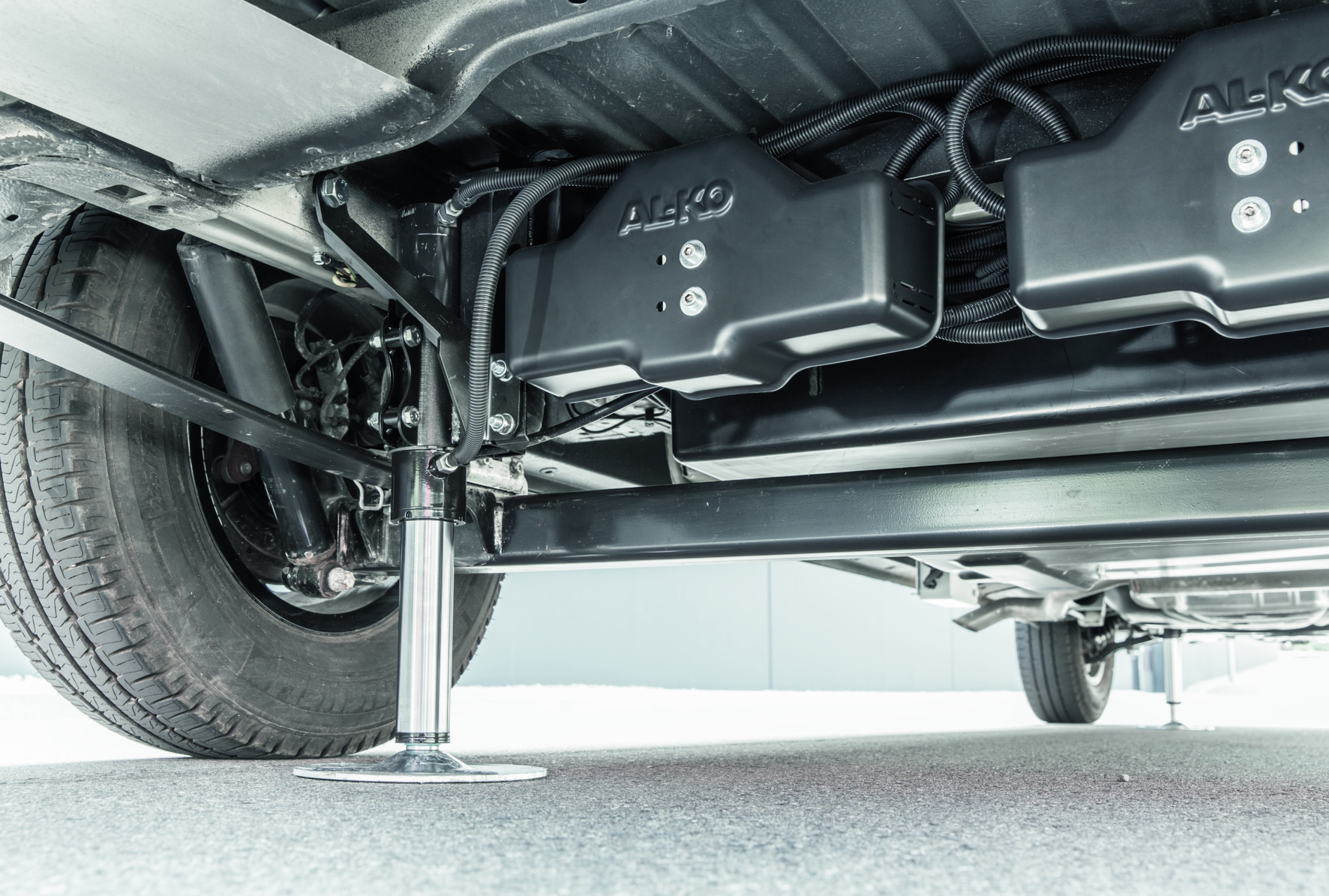 Horizontal alignment is just as simple, fast, and fully automatic with the Level M and HY4 hydraulic levelling systems for motorhomes. Level M works with a central hydraulic assembly, while the HY4 uses four small individual assemblies. In any case, the intelligent electronic controls ensure that the weight of the vehicle is always distributed uniformly across several supports. This prevents the chassis from becoming twisted. The Level M is operated as standard via a permanently installed control panel. There is also the option of operating the system using a touchpad or a smartphone via a Wi-Fi module. The HY4, on the other hand, offers a wired remote control or an optional control unit via a smartphone app, which can be used to weigh the vehicle axle by axle.