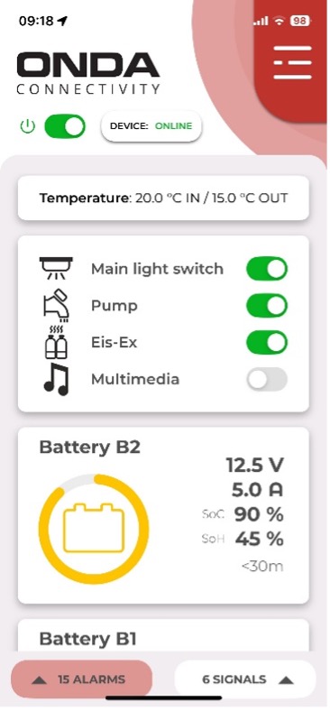 Antonio Paoletti, Sales Manager DACH Recreational Vehicles market: “With ONDA Connectivity Internet of Things (IoT) becomes reality. Just like home automation, our onboard system shares data in the cloud and allows communication with various devices, which can transmit information and receive commands through the app. You have full control, wireless and if you want remote.”